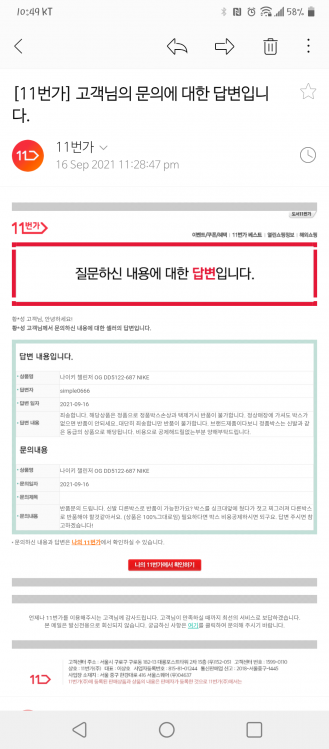 박스훼손으로 반품가능한지 문의한 캡쳐 첨부