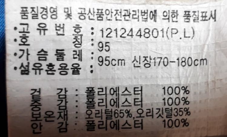 오리털 65% +오리깃털 35% / 사이즈= 택(95) 크게나옴 100.... 무료배송..........................